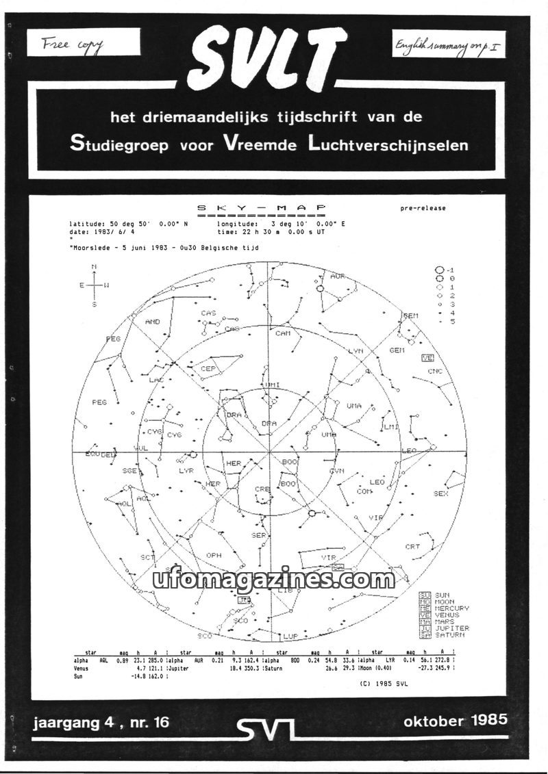 This issue of SVLT, dated October 1985, focuses on the application of 3D techniques in UFO research. The cover features a sky map generated for a sighting in Moorslede, Belgium, on