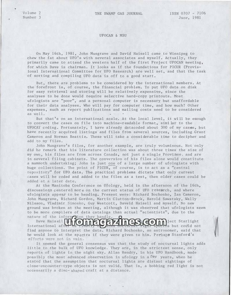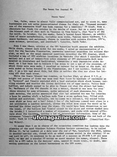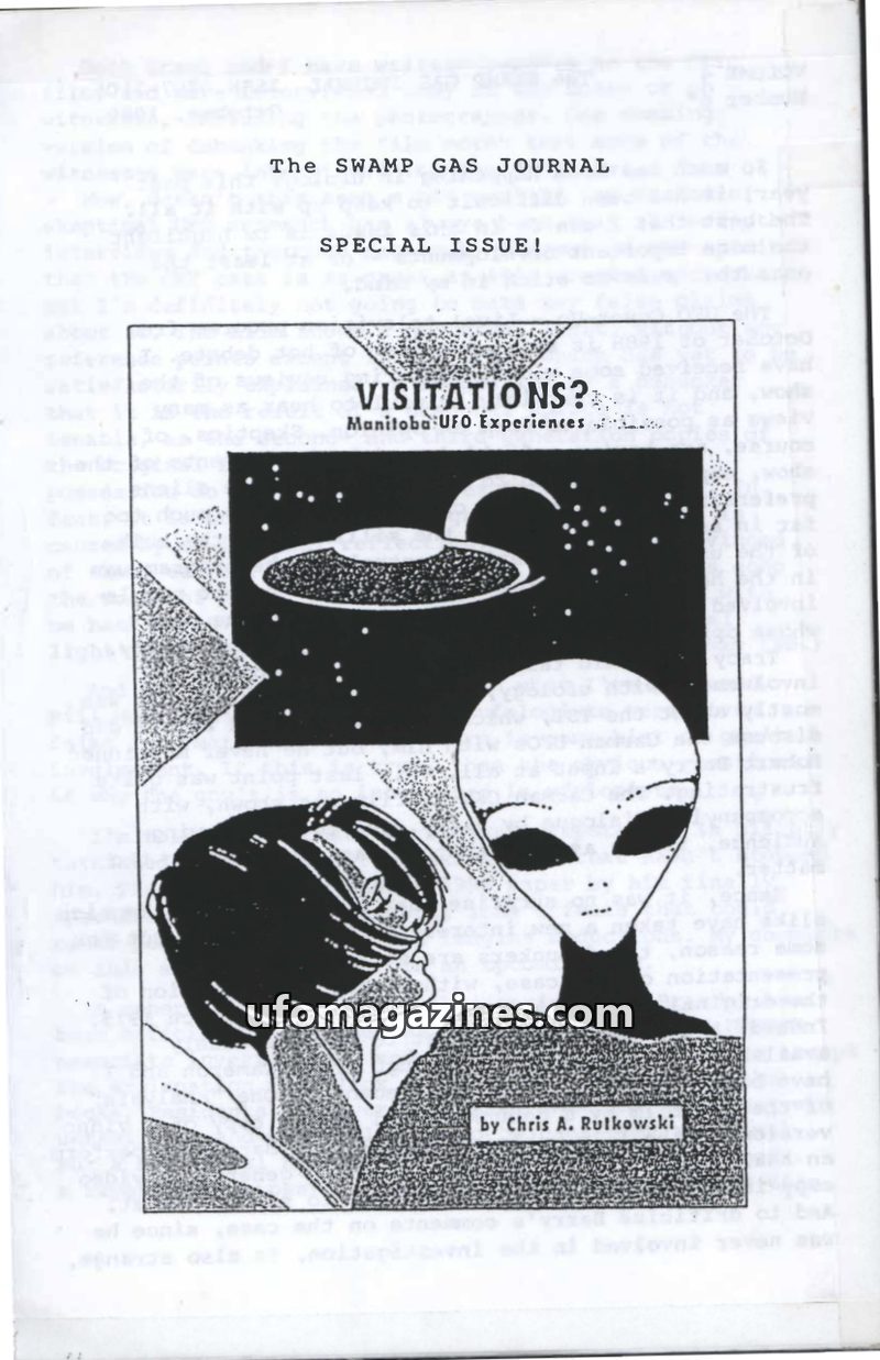 This issue of The Swamp Gas Journal returns after a delay, covering significant events in ufology. It features reports on recent UFO sightings in Manitoba, including detailed accou