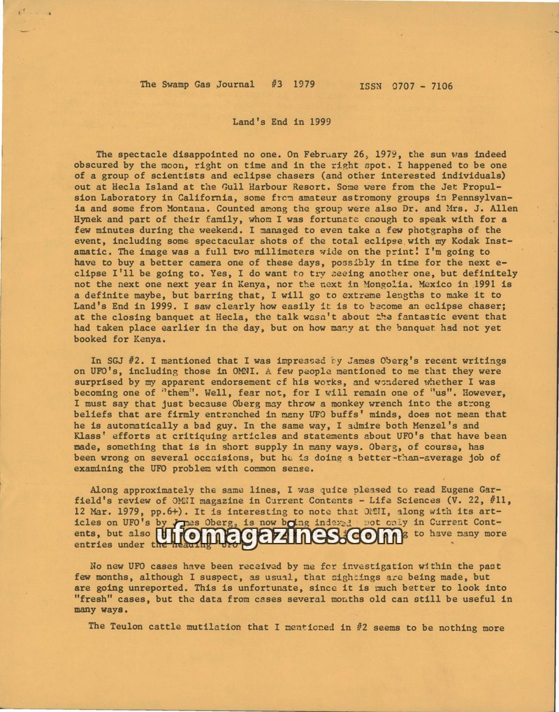 This issue of The Swamp Gas Journal features an account of a solar eclipse observed on February 26, 1979, at Hecla Island. The author discusses James Oberg's common-sense approach