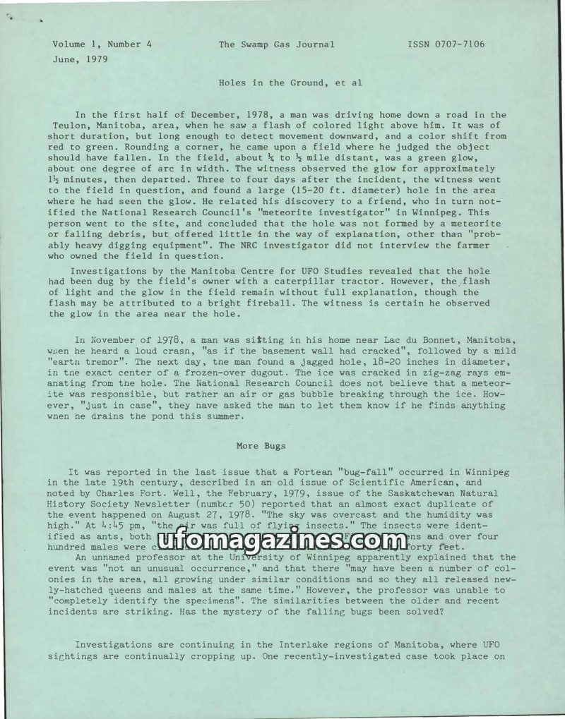 This issue of The Swamp Gas Journal reports on several unusual incidents in Manitoba during late 1978 and early 1979, including unexplained holes in the ground, a 'bug-fall' event