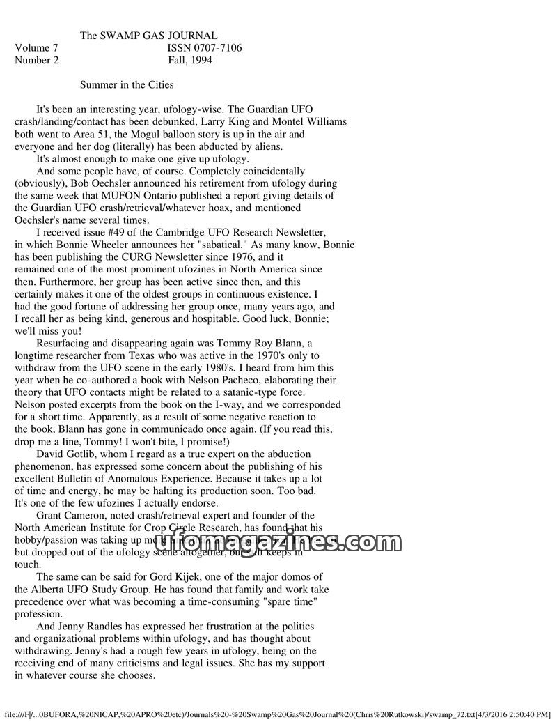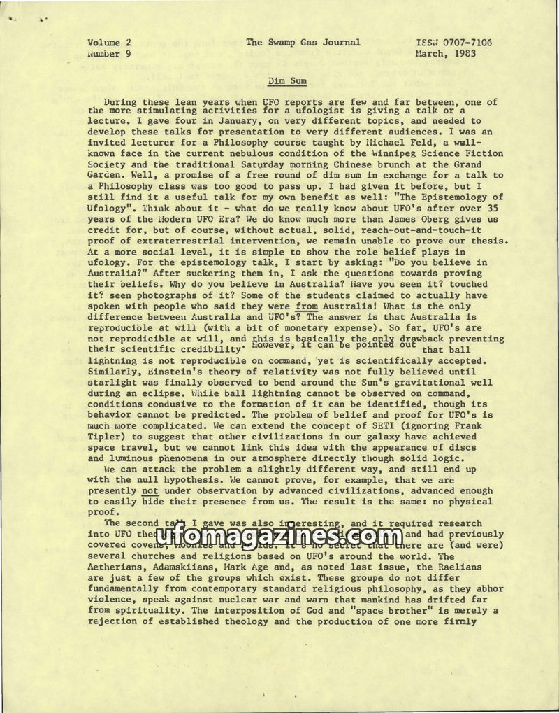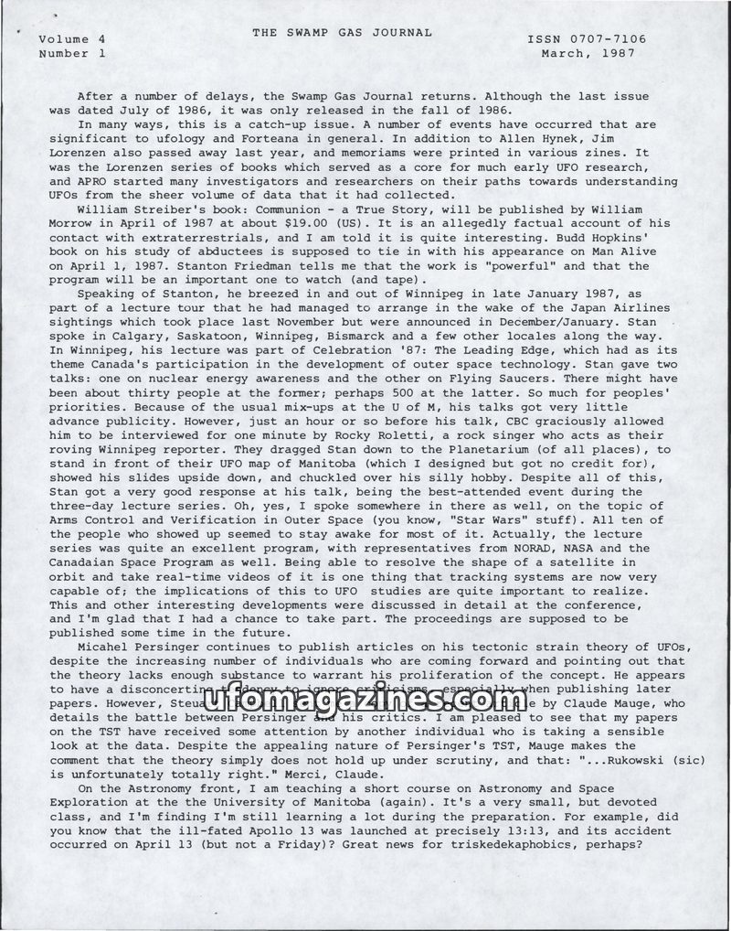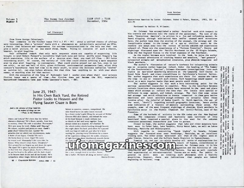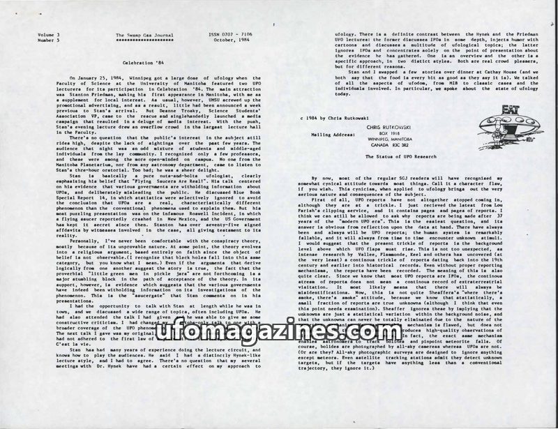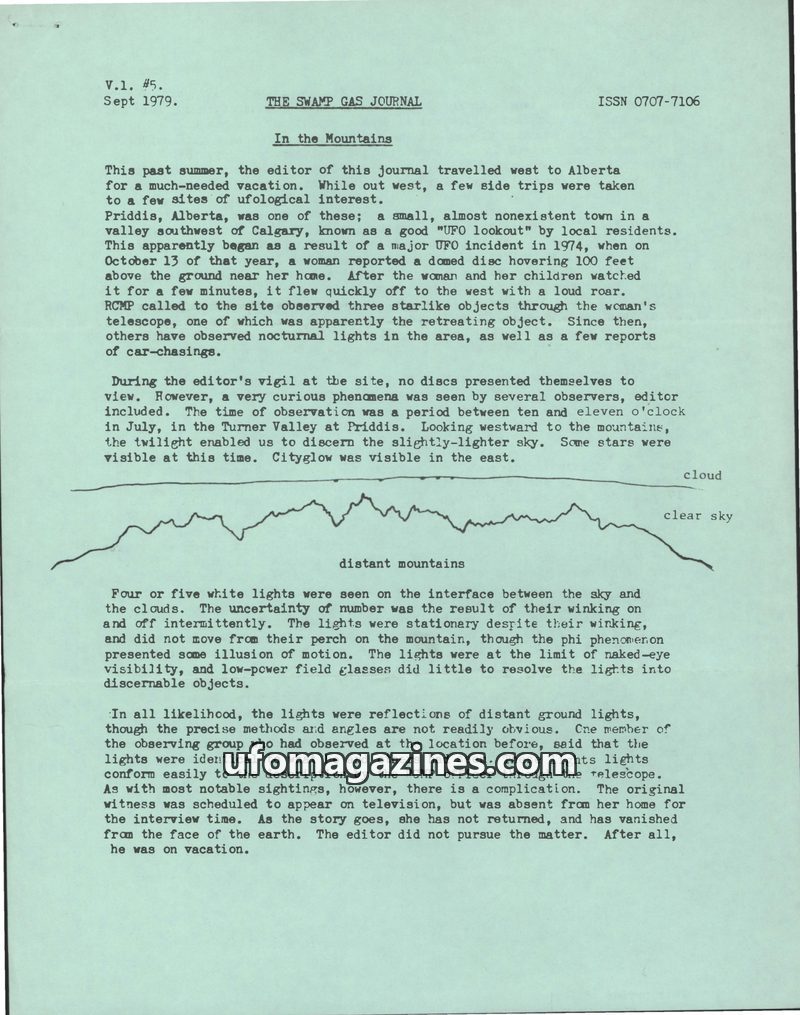 This issue of The Swamp Gas Journal covers several ufological and fortean topics. The editor recounts a UFO sighting of white lights in the mountains near Priddis, Alberta, and dis