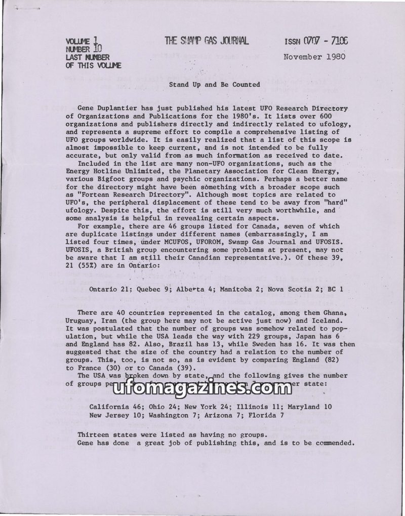 This issue of The Swamp Gas Journal reviews Gene Duplantier's extensive UFO Research Directory of the 1980s, noting its comprehensive scope and the distribution of listed organizat