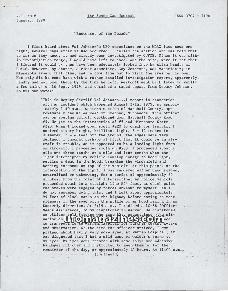 This issue of The Swamp Gas Journal details Deputy Sheriff Val Johnson's 1979 encounter with a bright light in Marshall County, Minnesota, which caused vehicle damage and a 39-minu