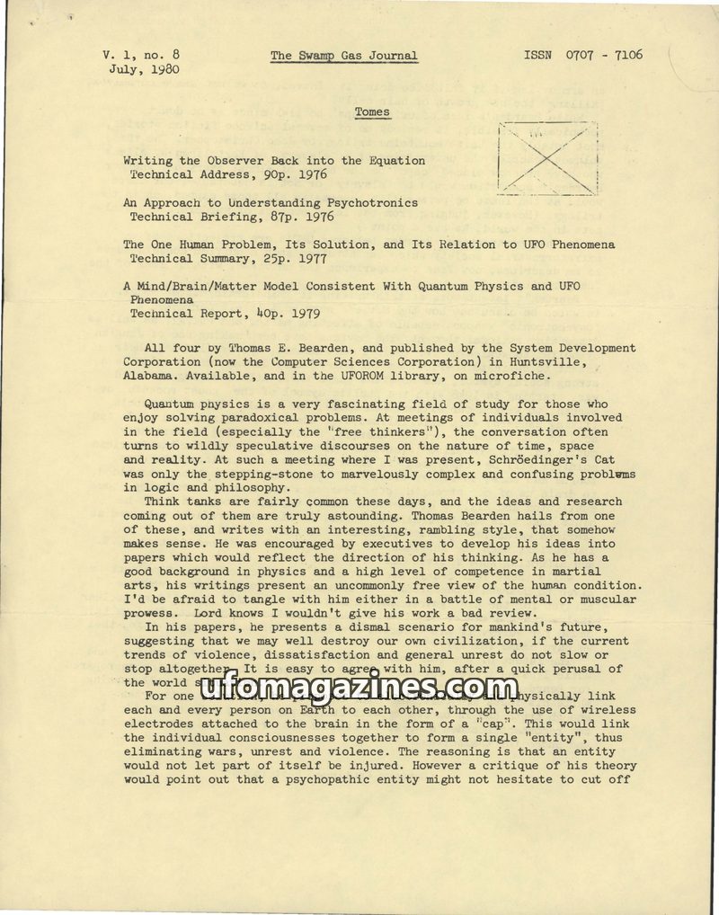 This issue of The Swamp Gas Journal from July 1980 reviews several works by Thomas E. Bearden, focusing on his theories about quantum physics, psychotronics, and a proposed solutio
