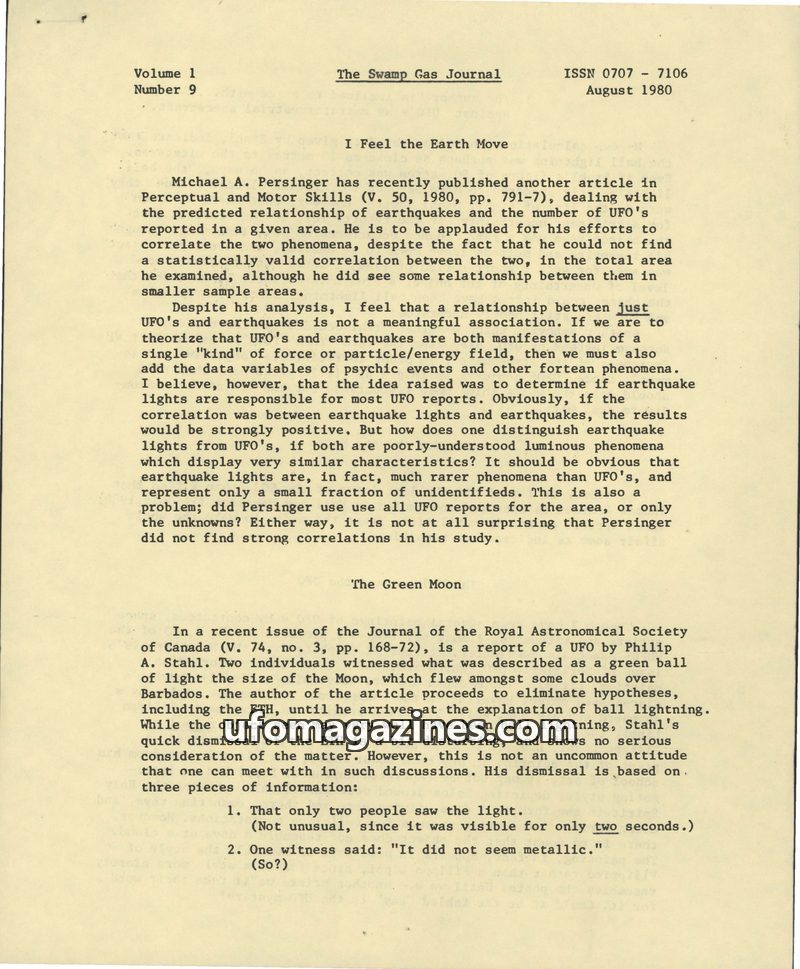 This issue of The Swamp Gas Journal explores the potential correlation between UFO sightings and earthquakes, referencing an article by Michael A. Persinger. It also details a sigh