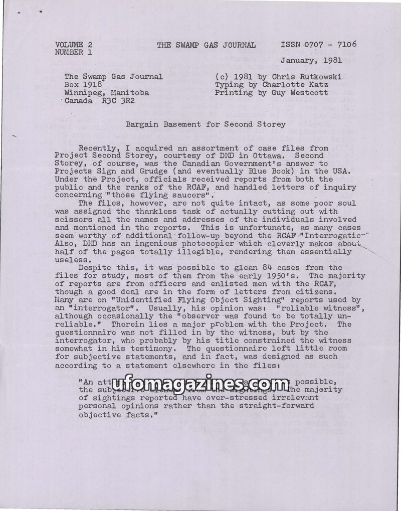 This issue of The Swamp Gas Journal reviews "Project Second Storey," the Canadian government's UFO investigation program, which ran concurrently with US projects like Sign and Grud