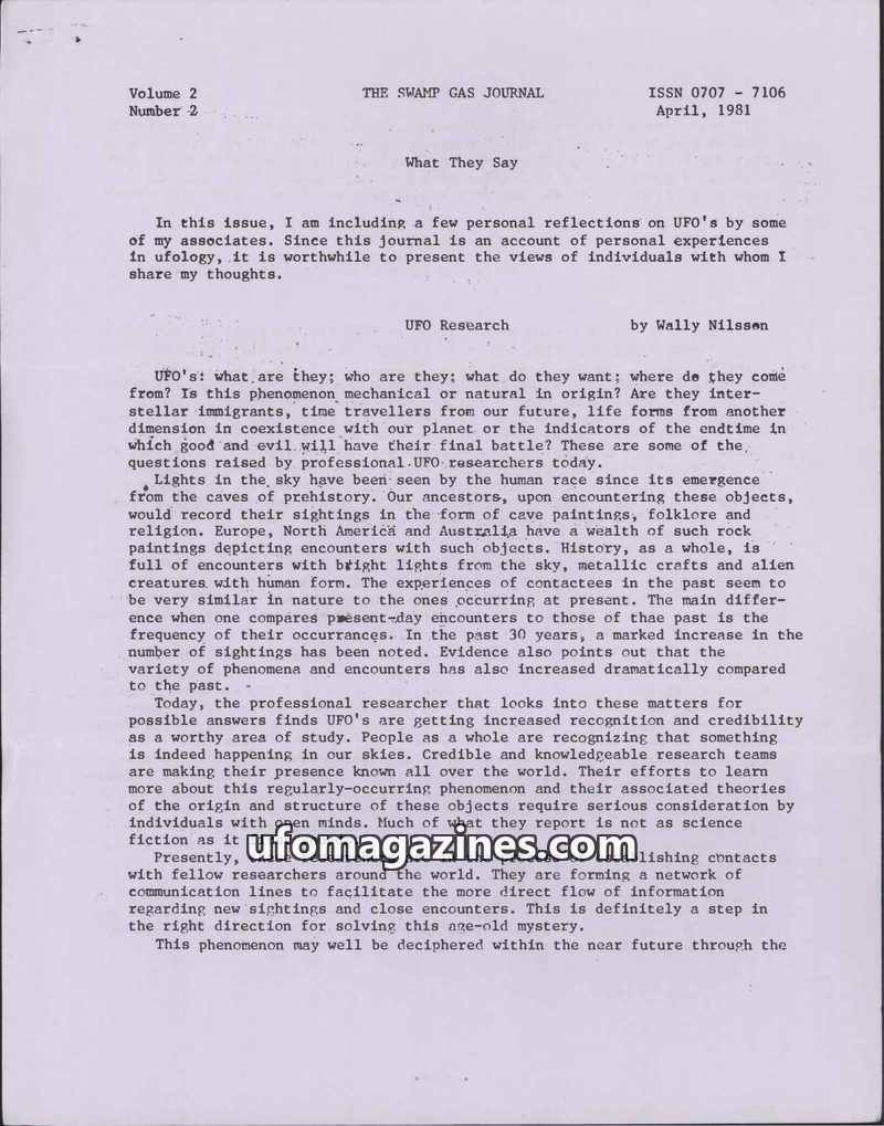 This issue of The Swamp Gas Journal features personal reflections on UFO phenomena, including the author's thoughts on the nature and origin of UFOs and the increasing credibility