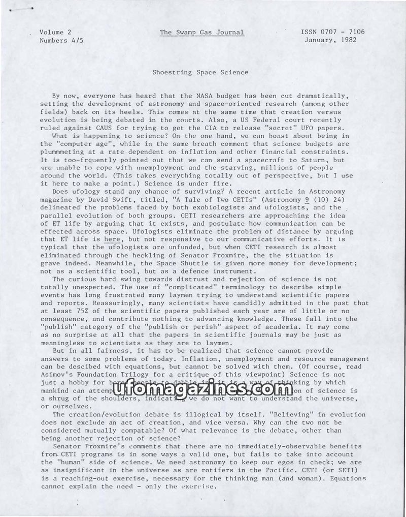 This issue of The Swamp Gas Journal, dated January 1982, focuses on the challenges facing science, particularly in the context of budget cuts and public skepticism. It explores the