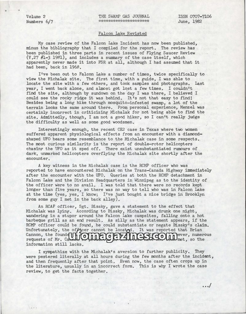 This issue of The Swamp Gas Journal revisits the Falcon Lake Incident, detailing the difficulties in locating the site and the conflicting testimonies regarding Stephen Michalak's