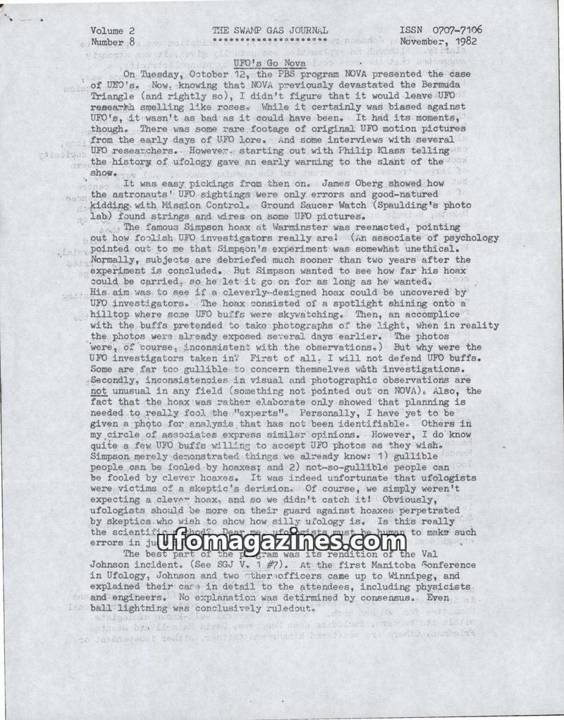 This issue of The Swamp Gas Journal critically reviews the PBS program NOVA's presentation on UFOs, noting its biased approach but acknowledging some interesting footage. It detail