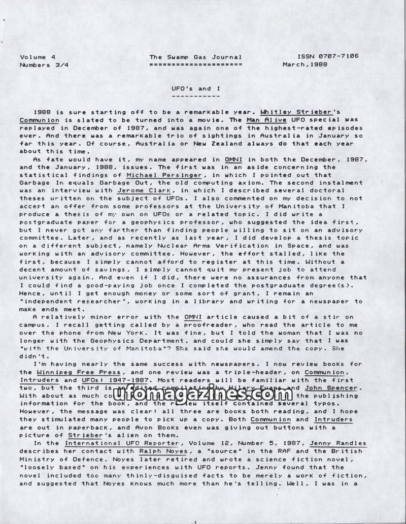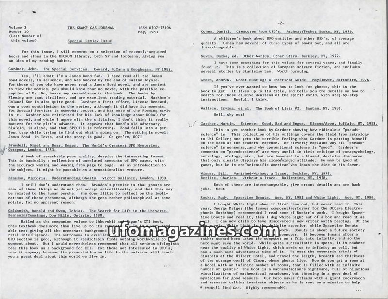 This issue of The Swamp Gas Journal covers personal UFO experiences, including the author's mention in OMNI magazine and his work as an 'independent researcher'. It reviews books l
