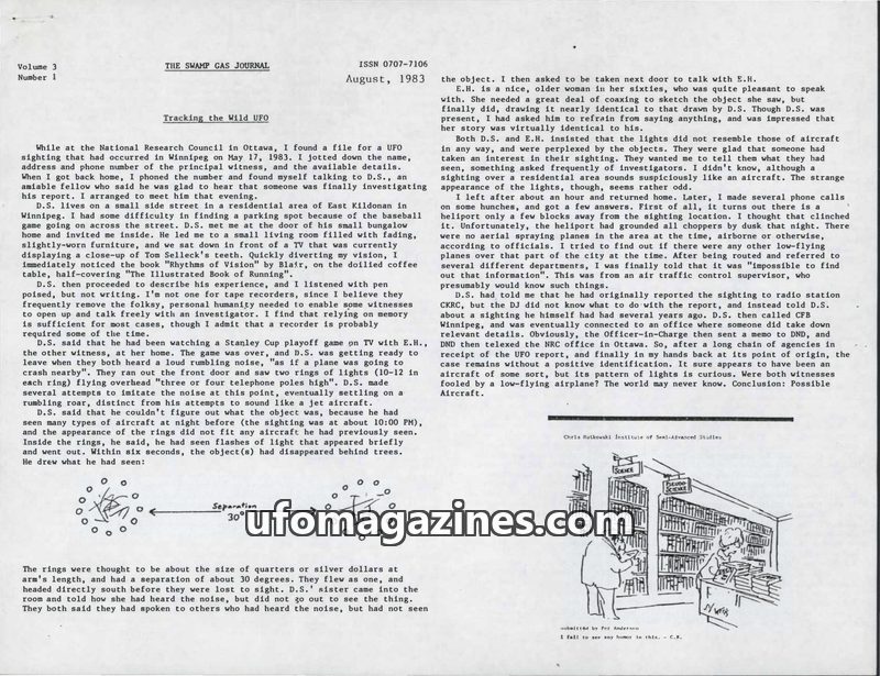 This issue details an investigation into a UFO sighting in Winnipeg, Canada, on May 17, 1983, by witnesses D.S. and E.H., who described seeing two rings of lights. The investigatio