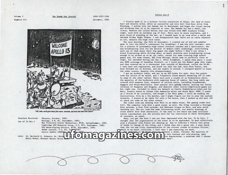 This issue of The Swamp Gas Journal covers a science fiction convention in Fargo, North Dakota, highlighting the prevalence of fantasy over hard science fiction. It reviews article