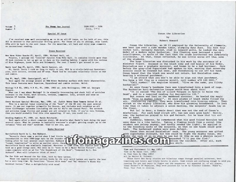 This issue of The Swamp Gas Journal is a Special SF Issue, featuring a parody story 'Conan the Librarian' by Robert Howard. It includes reviews of various science fiction fanzines