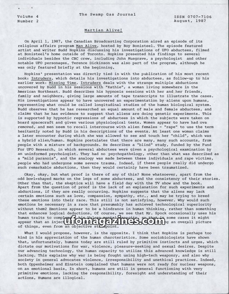 This issue of The Swamp Gas Journal features an episode of 'Man Alive' where Budd Hopkins discussed his UFO abduction research, detailing alleged alien experimentation and genetic