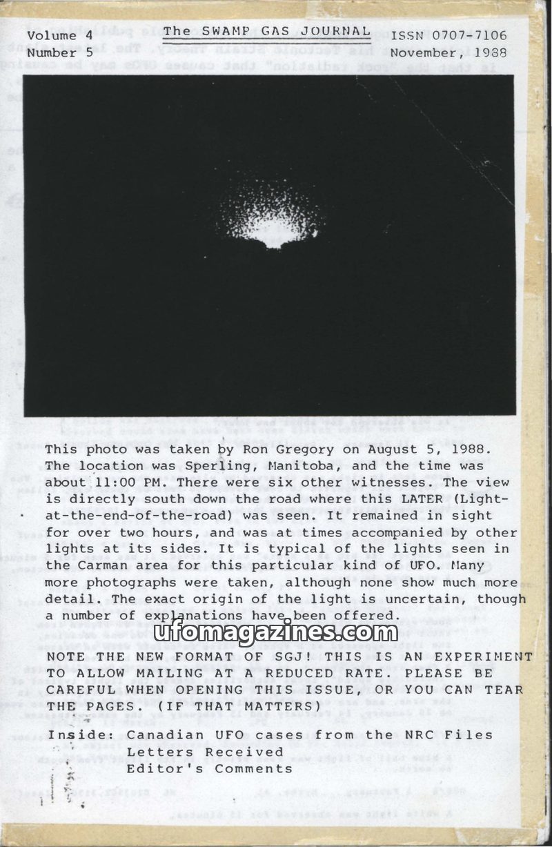 This issue of The Swamp Gas Journal focuses on UFO sightings in Canada, particularly the 'LATER' (Light-at-the-end-of-the-road) phenomenon observed in Sperling, Manitoba. It detail