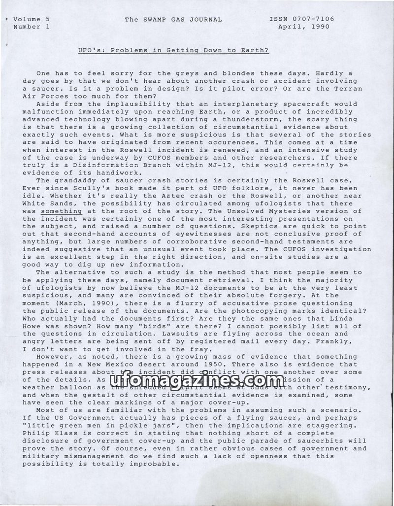 This issue of The Swamp Gas Journal reflects on a busy year in ufology, noting the debunking of the Guardian UFO crash, public interest in Area 51, and the rise of alien abduction