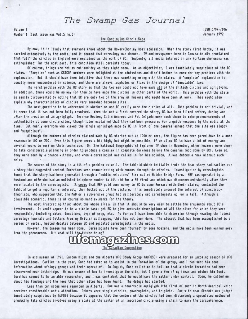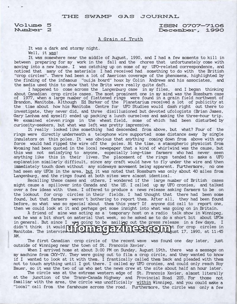 This issue of The Swamp Gas Journal focuses on Canadian crop circle phenomena in 1990, particularly the St. Francois Xavier case. It details the investigation efforts by UFOROM, hi