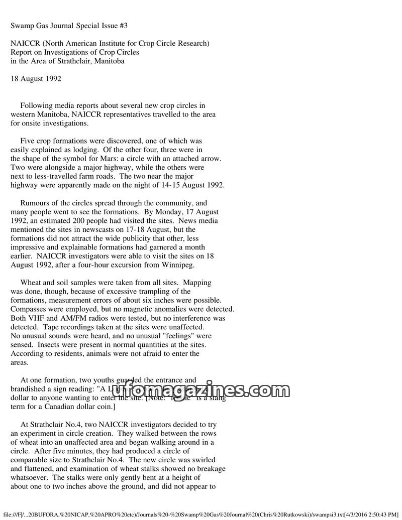 This special issue of The Swamp Gas Journal, "A Looney a Look," details an investigation into crop circles in Manitoba, Canada, in August 1992. The author, Chris A. Rutkowski, alon