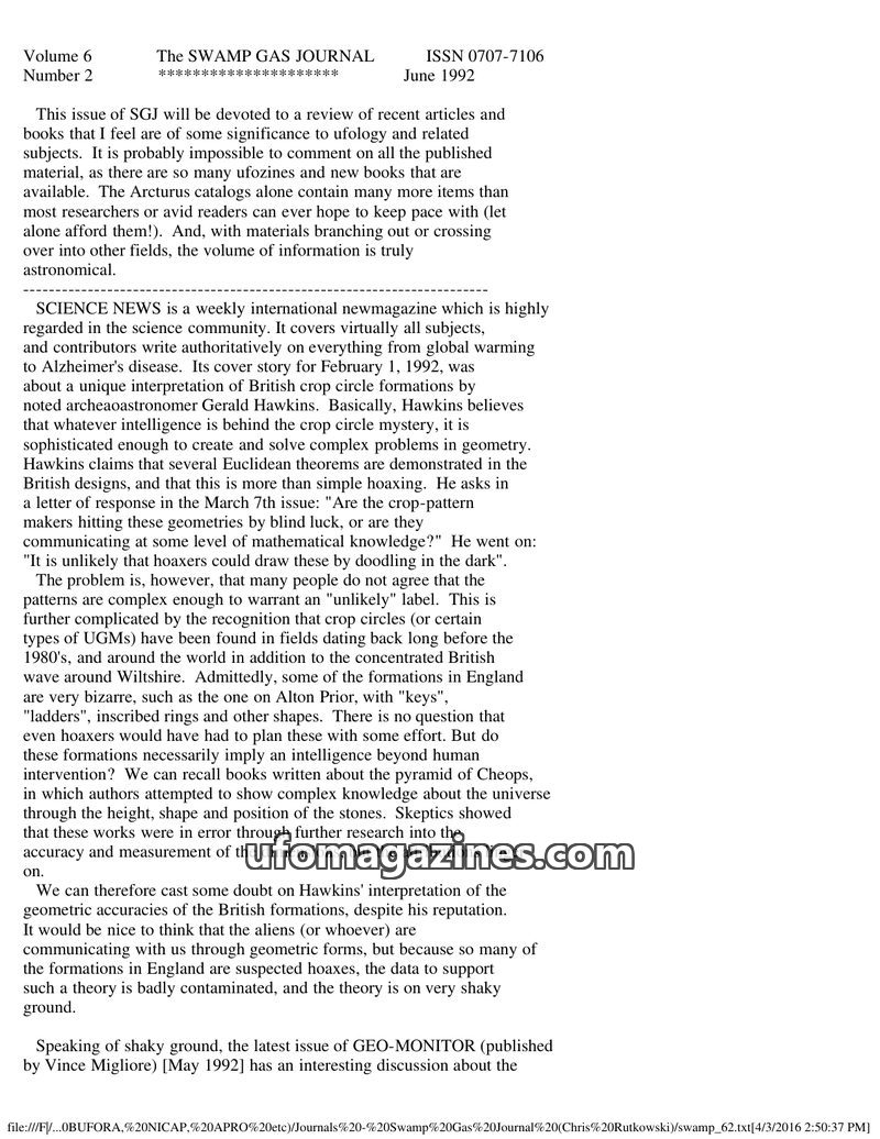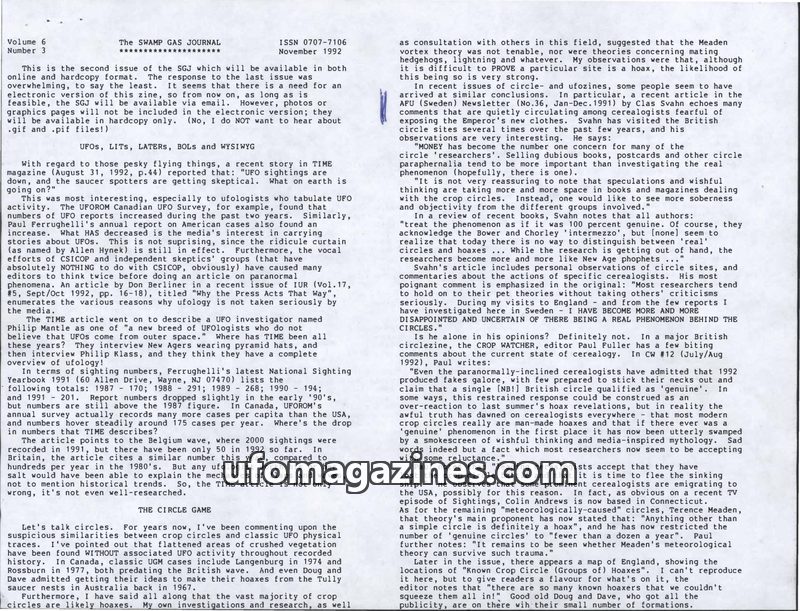 This issue of The Swamp Gas Journal reviews recent literature on ufology and related subjects. It discusses Gerald Hawkins' interpretation of crop circles as demonstrating geometri