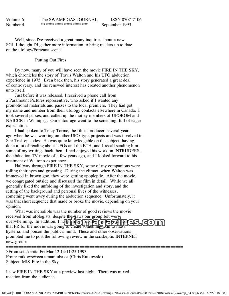 This issue of The Swamp Gas Journal discusses the movie 'Fire in the Sky', based on the Travis Walton UFO abduction case, and critically reviews its portrayal of the event. It also