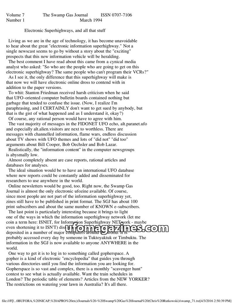 This issue of The Swamp Gas Journal discusses the burgeoning 'electronic information superhighway' and its implications for UFO research, noting the prevalence of low-quality infor
