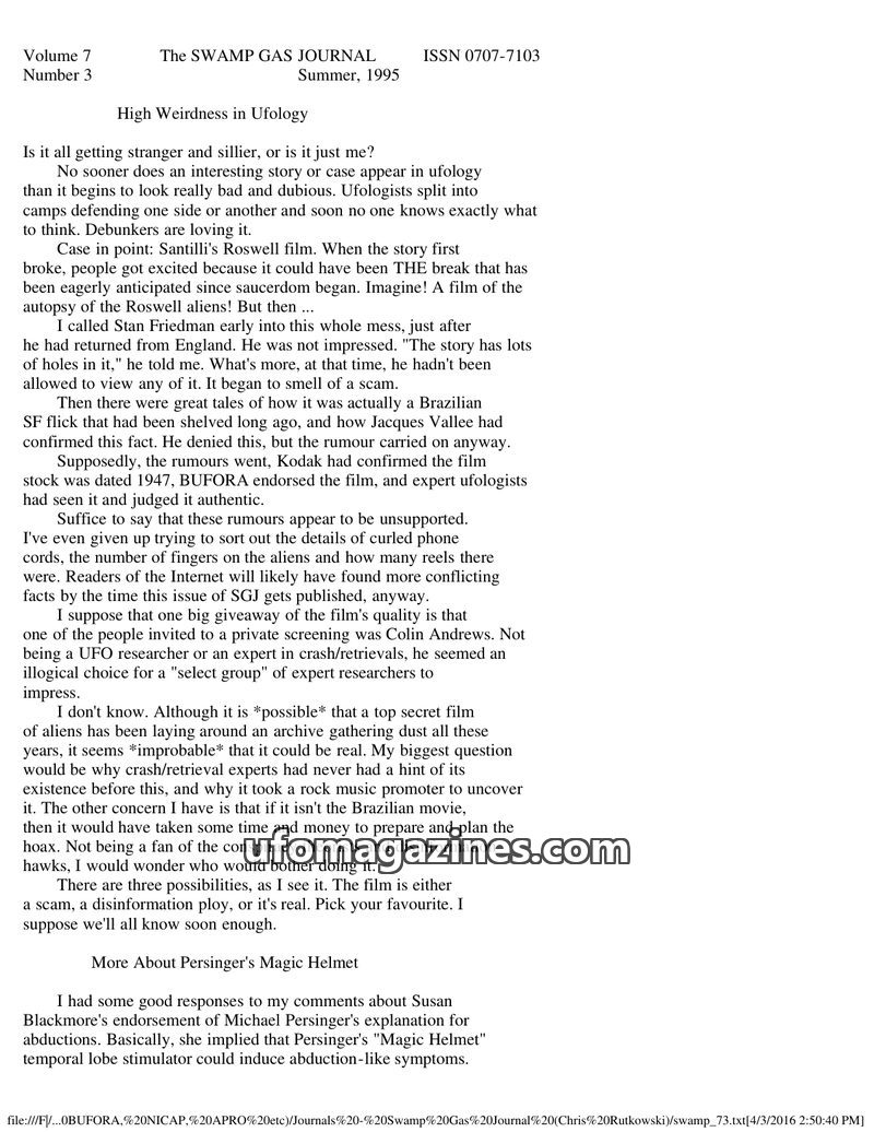 This issue of The Swamp Gas Journal delves into 'High Weirdness in Ufology,' questioning the authenticity of the Santilli Roswell film and exploring Michael Persinger's 'Magic Helm