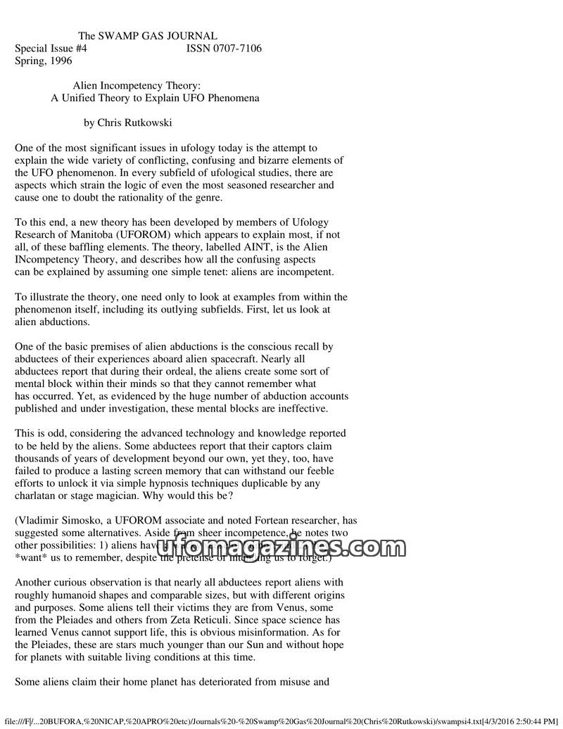 This issue of The Swamp Gas Journal introduces the 'Alien Incompetency Theory' (AINT), developed by Ufology Research of Manitoba (UFOROM). The theory suggests that the confusing an