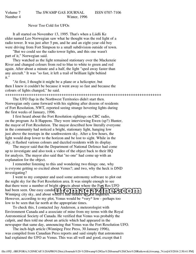 This issue of The Swamp Gas Journal investigates UFO sightings in Canada's Northwest Territories, with initial reports of hovering lights near Fort Resolution being explained by so