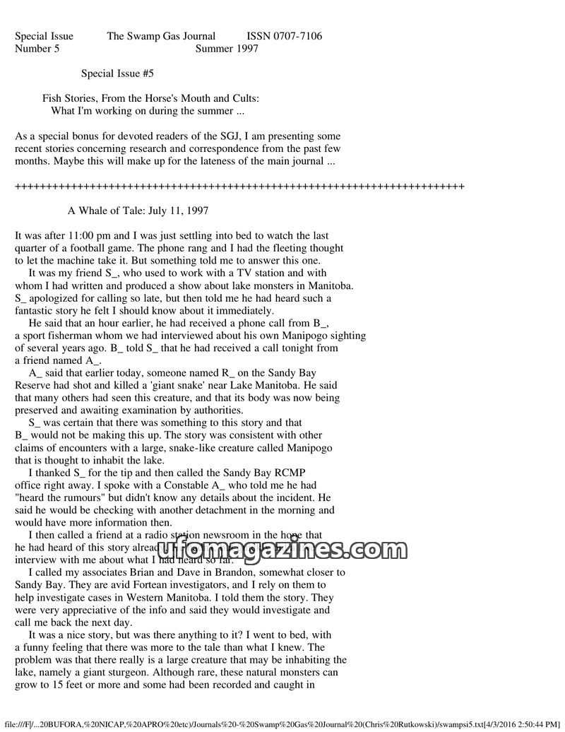 This issue of The Swamp Gas Journal covers a purported lake monster sighting and killing near Lake Manitoba, which ultimately proved to be a hoax involving a large sturgeon and loc