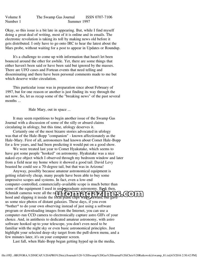 This issue of The Swamp Gas Journal, Summer 1997, critically examines several prominent UFO and Fortean claims circulating at the time. It debunks the 'Hale-Bopp companion' or 'Hal