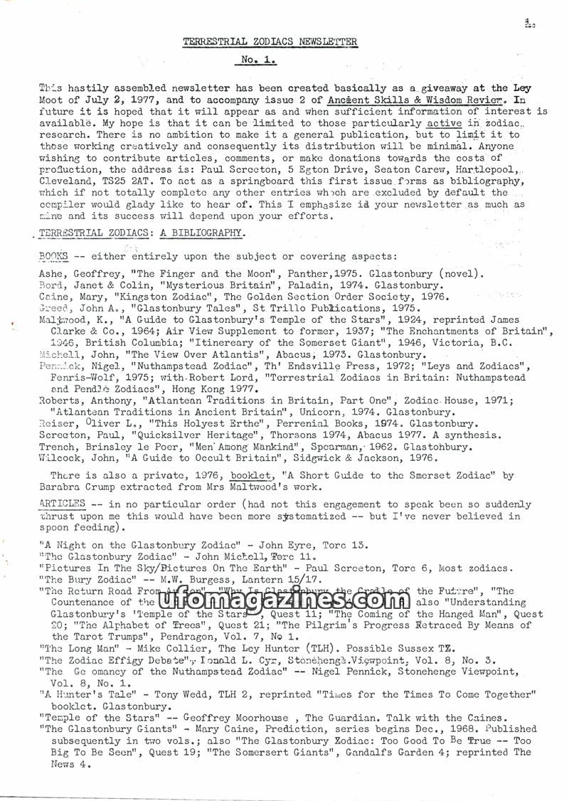 This first issue of the Terrestrial Zodiacs Newsletter, dated July 1977, serves as a giveaway at the Ley Moot and accompanies issue 2 of Ancient Skills & Wisdom Review. It is inten