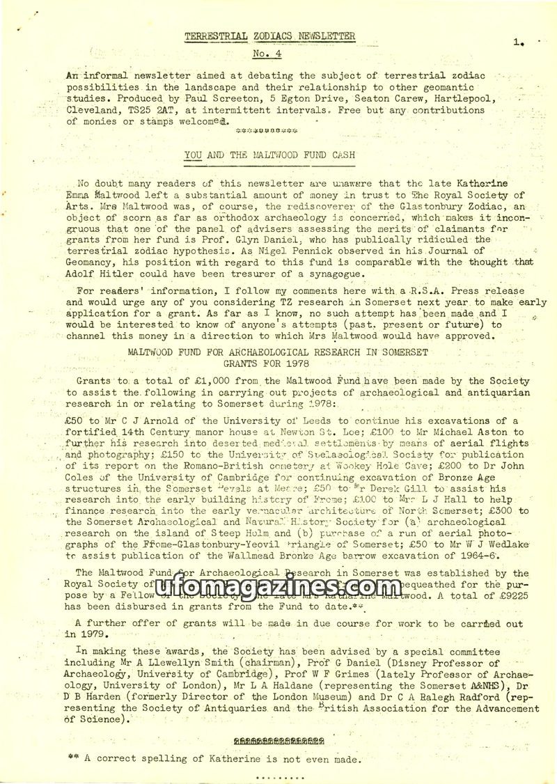 This issue of the Terrestrial Zodiacs Newsletter (No. 4) focuses on the Maltwood Fund for Archaeological Research in Somerset, detailing grants awarded in 1978 and the advisory com
