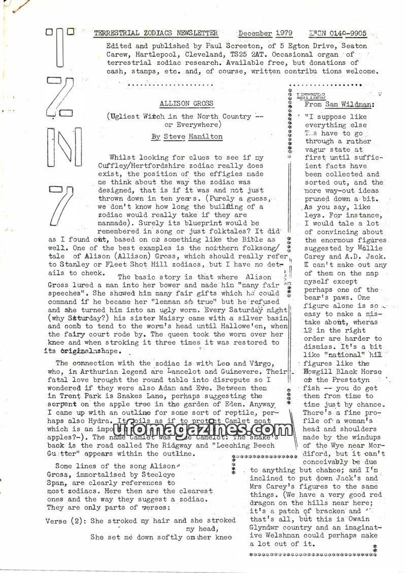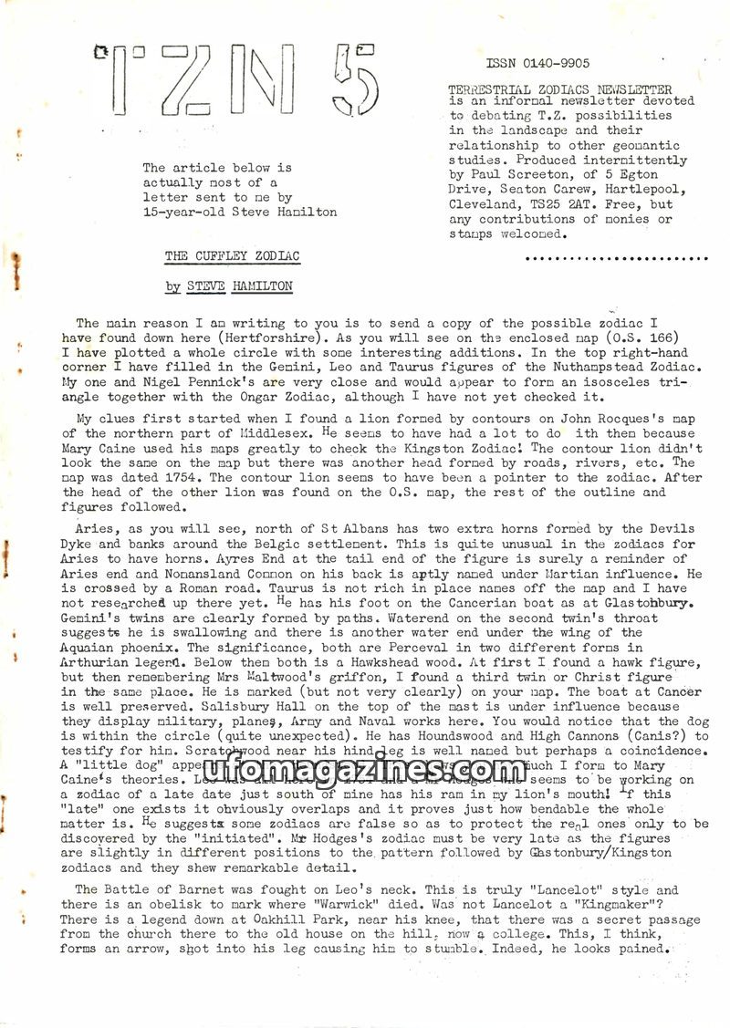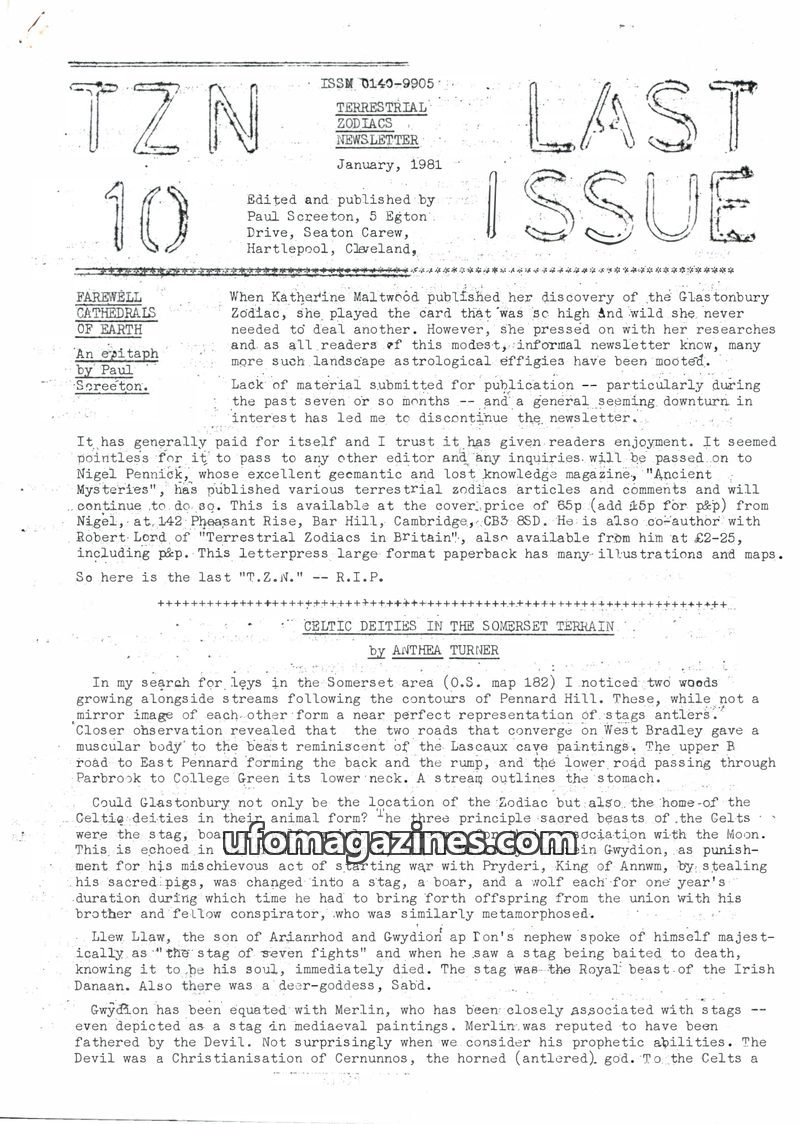 This is the final issue of the Terrestrial Zodiacs Newsletter, published in January 1981. The editor, Paul Screeton, cites a lack of submitted material and a general downturn in in
