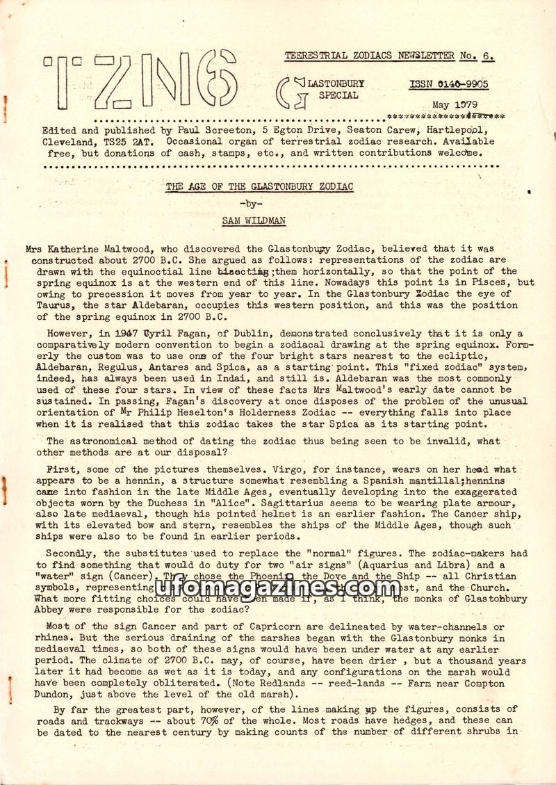 This issue of Terrestrial Zodiacs Newsletter focuses on the Glastonbury Zodiac. Sam Wildman challenges Katherine Maltwood's dating of the zodiac to 2700 B.C., arguing based on clot