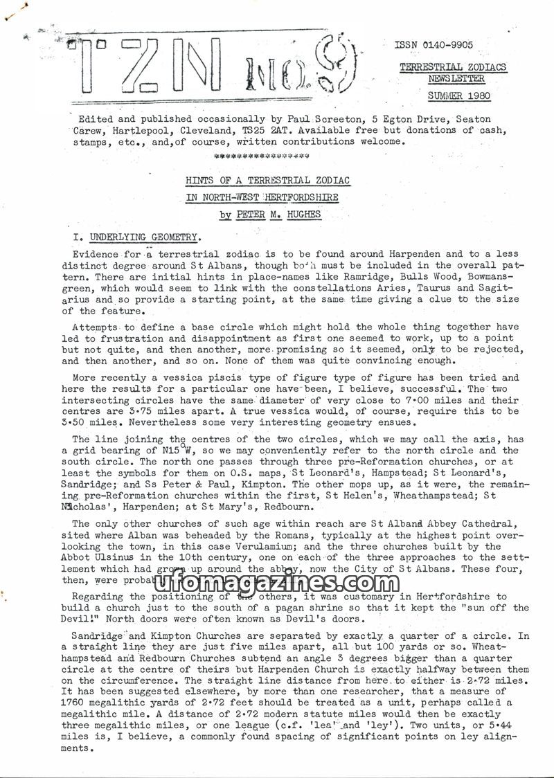 This issue of Terrestrial Zodiacs Newsletter features an article by Peter M. Hughes on a potential terrestrial zodiac in North-West Hertfordshire, analyzing geometric patterns of p