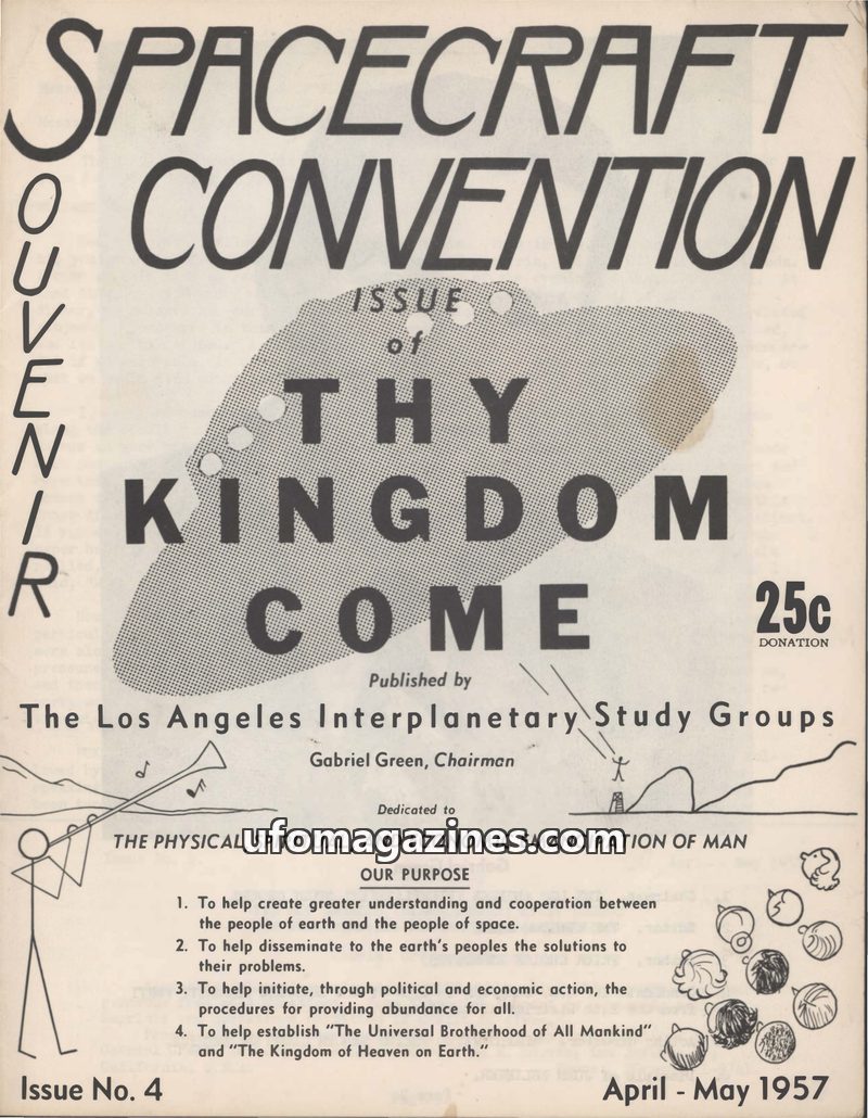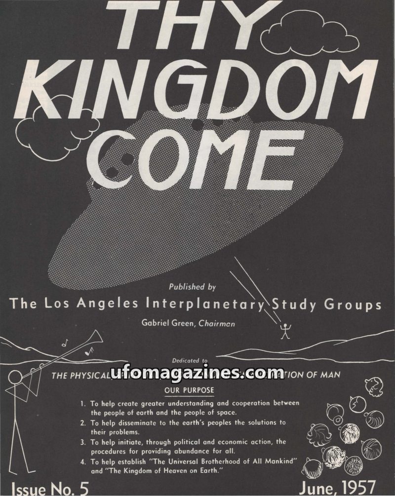 This issue of 'Thy Kingdom Come' from April-May 1957, published by The Los Angeles Interplanetary Study Groups, focuses on communications from alleged space entities and UFO phenom