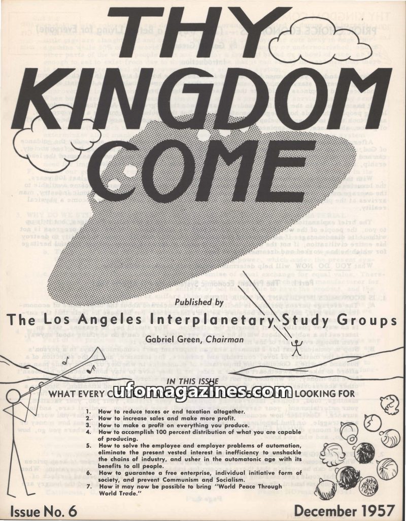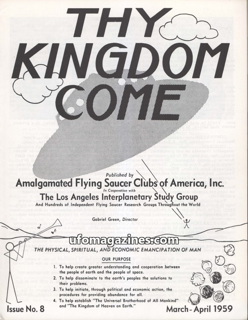 This issue of 'Thy Kingdom Come' (March-April 1959) focuses on the Amalgamated Flying Saucer Clubs of America's (AFSCA) mission for 'physical, spiritual, and economic emancipation.
