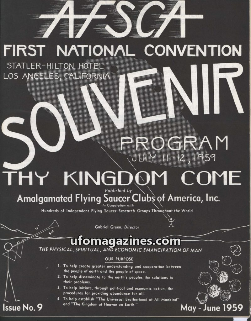 This document is the souvenir program for the First National Convention of the Amalgamated Flying Saucer Clubs of America (AFSCA), held July 11-12, 1959, at the Statler-Hilton Hote