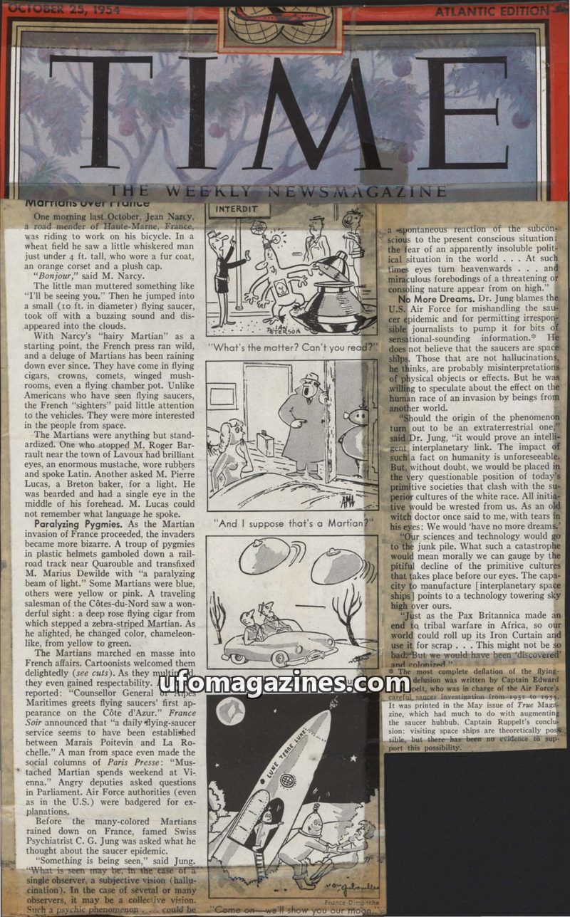 This TIME Magazine issue from October 25, 1954, details a wave of alleged Martian sightings across France. Reports describe various alien appearances and craft, from small whiskere
