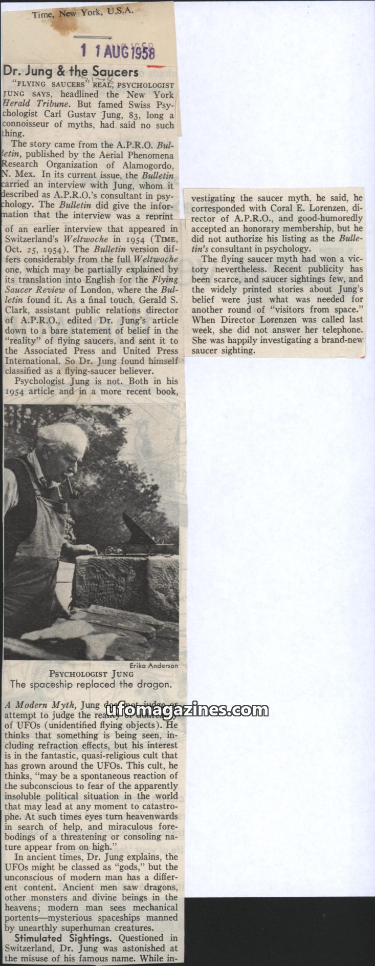The article addresses the misrepresentation of psychologist Carl Jung as a flying saucer believer, stemming from an interview published by A.P.R.O. Jung himself stated he did not j