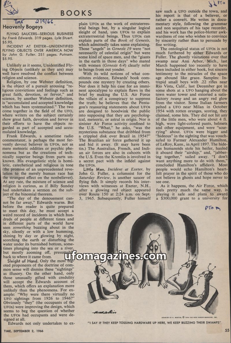 This issue of TIME magazine reviews two books on UFOs: Frank Edwards' 'Flying Saucers-Serious Business' and John G. Fuller's 'Incident at Exeter'. Edwards posits UFOs are extraterr