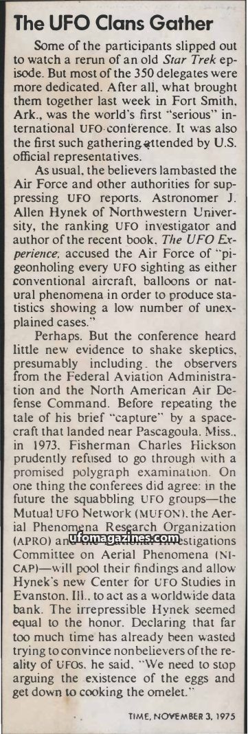 The article covers the first 'serious' international UFO conference held in Fort Smith, Arkansas, attended by approximately 350 delegates and U.S. official representatives. Astrono