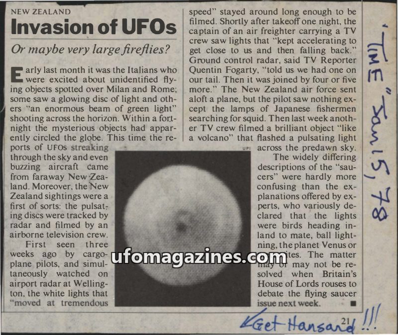 The issue reports on recent UFO sightings in New Zealand and Italy, with descriptions ranging from glowing discs to beams of green light. In New Zealand, pulsating discs were track