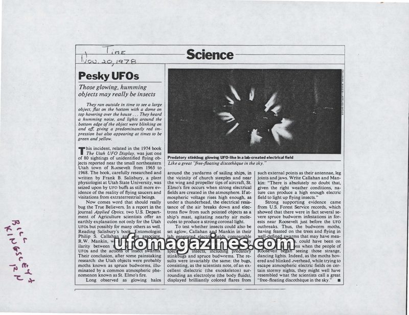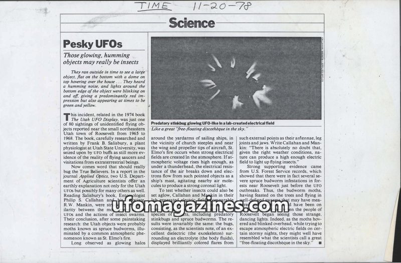 A TIME magazine article from November 20, 1978, explores the possibility that unidentified flying objects (UFOs) reported in Roosevelt, Utah, between 1965 and 1968 were actually il