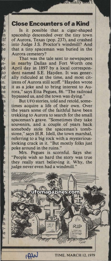 The article recounts the 1897 alleged UFO crash in Aurora, Texas, where a cigar-shaped spaceship reportedly descended and crashed into a windmill, with a tiny spaceman buried in th