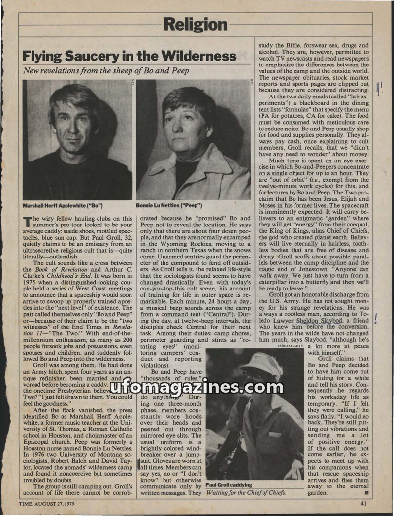 The article profiles Paul Groll, a former Presbyterian who joined the 'Bo and Peep' cult in 1975. The cult, led by Marshall Herff Applewhite ('Bo') and Bonnie Lu Nettles ('Peep'),