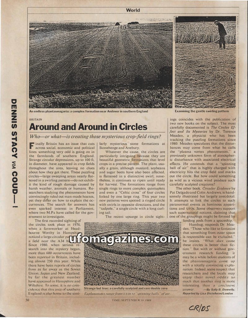 Mysterious crop circles, up to 100 ft. in diameter and exhibiting precise swirling patterns, have appeared in British farmlands since 1976, with over 600 occurrences reported by 19