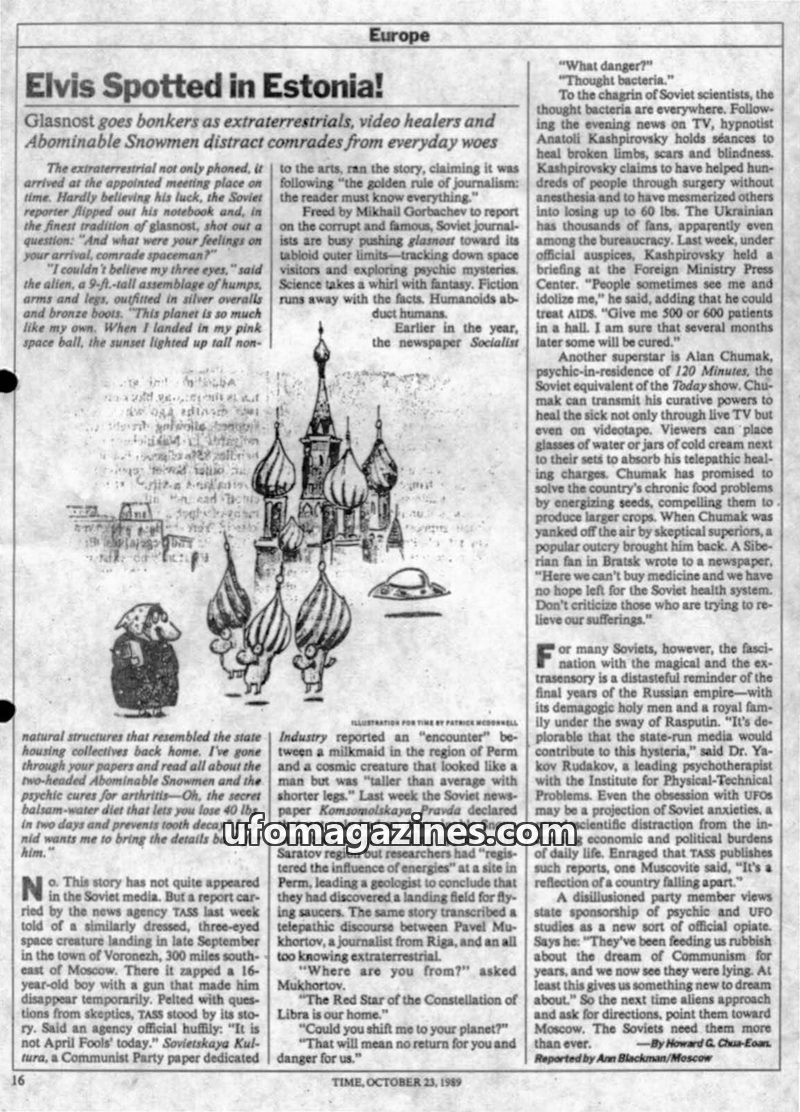 The issue highlights the burgeoning tabloid journalism in the Soviet Union under glasnost, with reports of extraterrestrial encounters in Estonia and Voronezh, and the phenomenon o