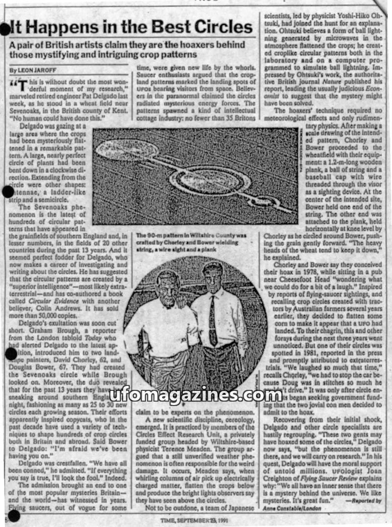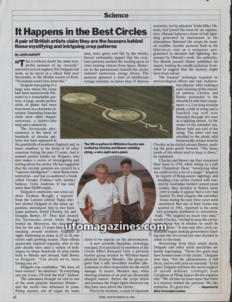 Two British artists, David Chorley and Douglas Bower, have confessed to being the creators of many of the crop circles that have mystified the public for years. They used simple to